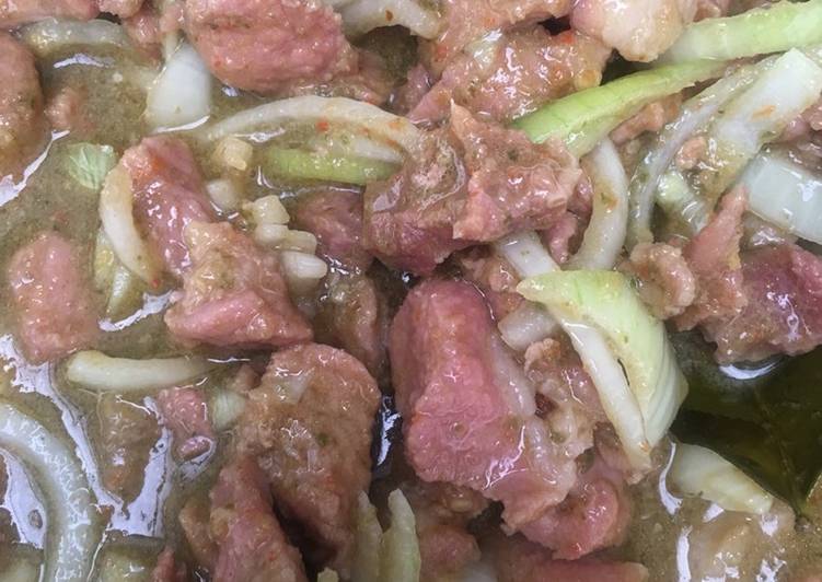- Masukan daging, berikan air agar bumbu meresap..kocek sesekali sampai daging matang lalu masukan irisan bawang bombay.