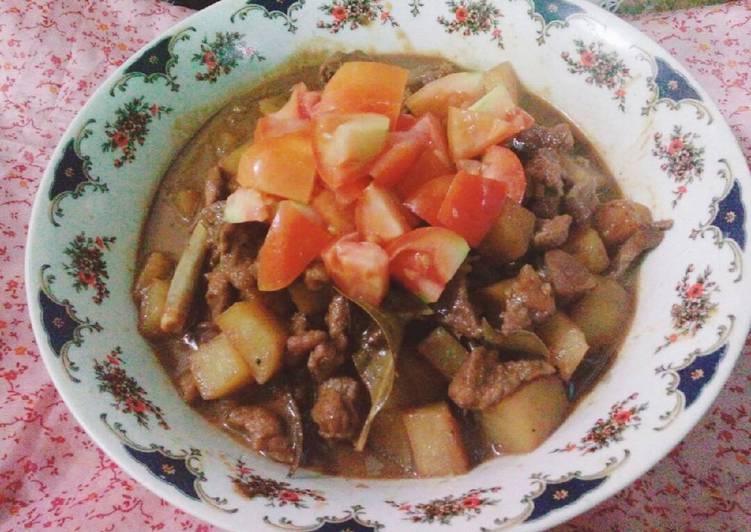 - Tambahkan 3 sendok makan minyak, tuang bumbu halus oseng sampai harum tambahkan daun salam & sereh aduk sampai bumbu harum, setelah itu masukan kayu manis,cengkeh,kecap manis lalu aduk sampai harum setelah itu masukan daging dan kentangnya, tambahkan santan,dan air secukupnya tambahkan garam,gula merah,lada dan penyedap biarkan 15 menit sampai air surut sedikit dan bumbu meresap.