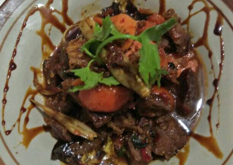 - Tumis bumbu dan bumbu halus sampai harum, masukan daging, siram kaldu, didihkan tambah gula dan penyedap, siapp untuk dihidangkan..