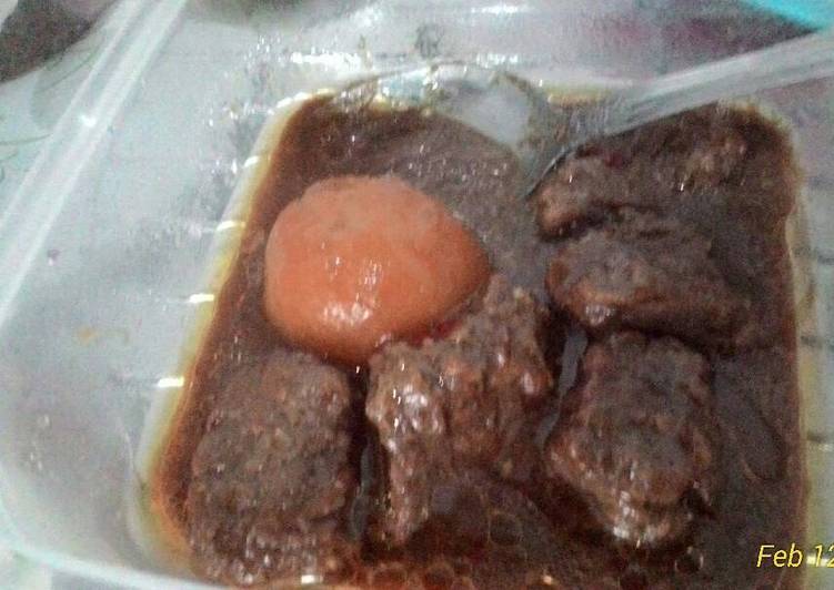 - Tambahkan 1 gelas air panas, aduk.perlahan, cek keempukan daging, masak hingga kuah kembali berkurang. Koreksi rasa. Sajikan hangat.